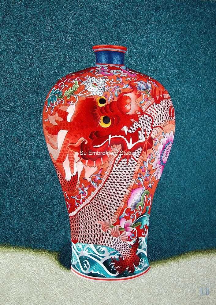 This Chinese silk embroidery depicts a Mei Ping vase, a type of Chinese porcelain vase that is traditionally used to display branches of plum blossoms. The vase is intricately hand embroidered with various patterns and motifs, including a dragon as its main part and a lotus flower. The body of the dragon is precisely embroidered so that one can see its details very clearly. It is red predominantly and forms a sharp contrast with the blue background which is also hand embroidered. The vase is hand embroidered in plain stitches, the background embroidered in random stitches.