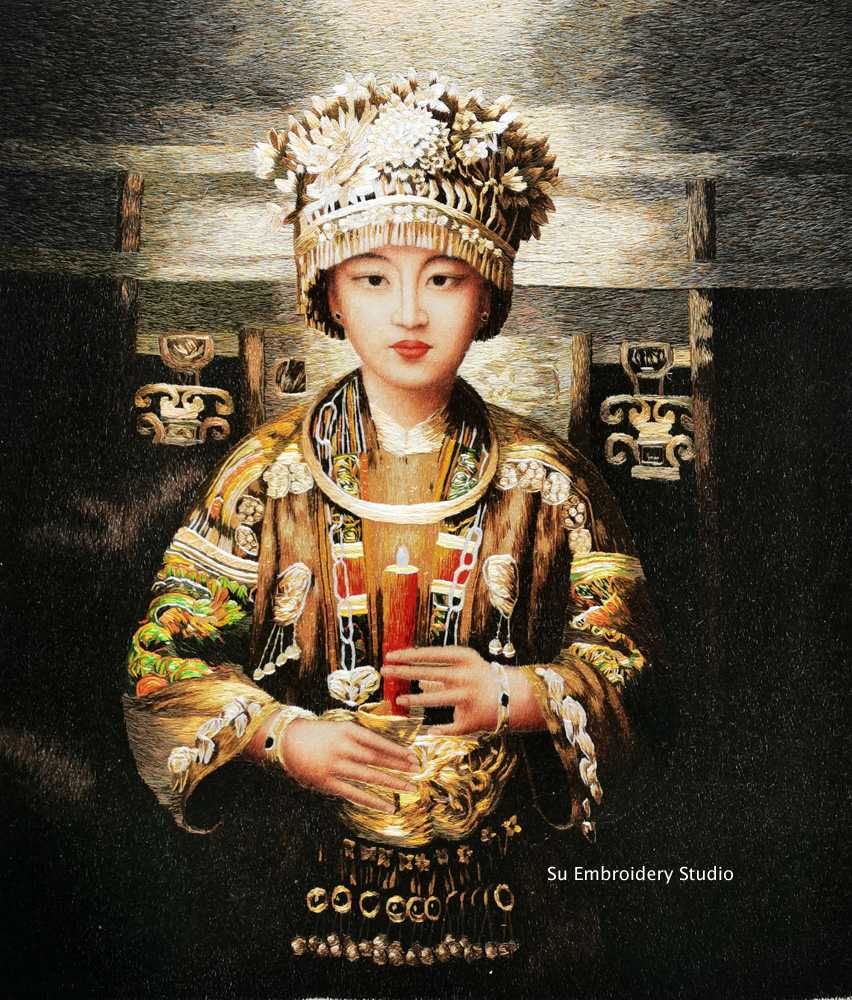 In this captivating Chinese silk embroidery, a young girl adorned in traditional Miao attire takes center stage. Her ornate costume features intricate patterns and vibrant colors, reflecting the rich cultural heritage of the Miao minority in China. All the details on her costume are intricately hand embroidered with fine silk threads. The face and hands of the Miao girl are embroidered in plain stitches with finer silk threads than in the background, making it look smooth and natural. The light of the candle adds a tough of mystery to the embroidered artwork. The background, with its darker tones, hints an indoor setting adorned with carvings. Overall, this silk embroidery artwork celebrates the beauty and craftsmanship Chinese embroidery with Miao culture.