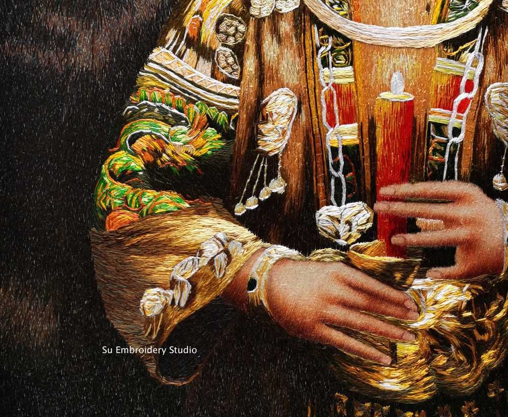 Adorned in vibrant colors and intricate patterns, her costume pays homage to the rich cultural heritage of the Miao minority in China, known for their distinctive customs and craftsmanship. The Miao people, also known as the Hmong, are one of China's 55 officially recognized ethnic minorities, with a unique cultural identity deeply rooted in their traditions, language, and dress. Every detail of her attire is meticulously hand embroidered with fine silk threads, showcasing the artistry of Chinese embroidery. The girl's face and hands are delicately stitched with plain stitches, lending a lifelike quality to the embroidery artwork. Illuminated by the soft glow of a candle, the scene exudes a sense of mystery and allure.