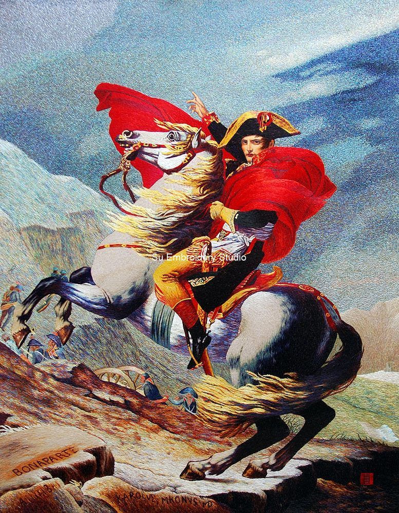 This exquisite silk embroidery faithfully reproduces the grandeur of Jacques-Louis David's iconic painting, "Napoleon Bonaparte Crossing the Alps." The masterful use of silk threads breathes life into the equestrian portrait, capturing the essence of Napoleon's commanding presence and the dramatic mountainous backdrop.