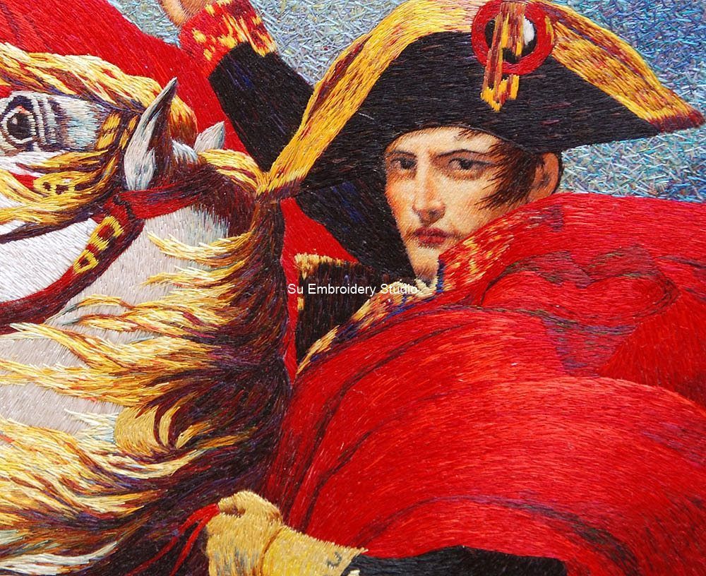 The meticulous stitching meticulously replicates the intricate details of Napoleon's military uniform, emphasizing the golden epaulettes, vibrant red sash, and the determined expression on his face. The horse, rendered with finesse and precision, conveys a sense of power and dynamism as it ascends the rugged terrain.