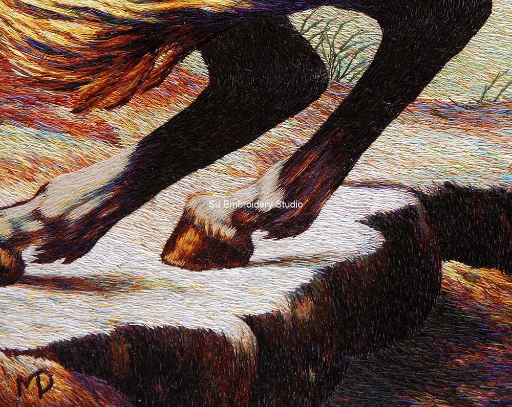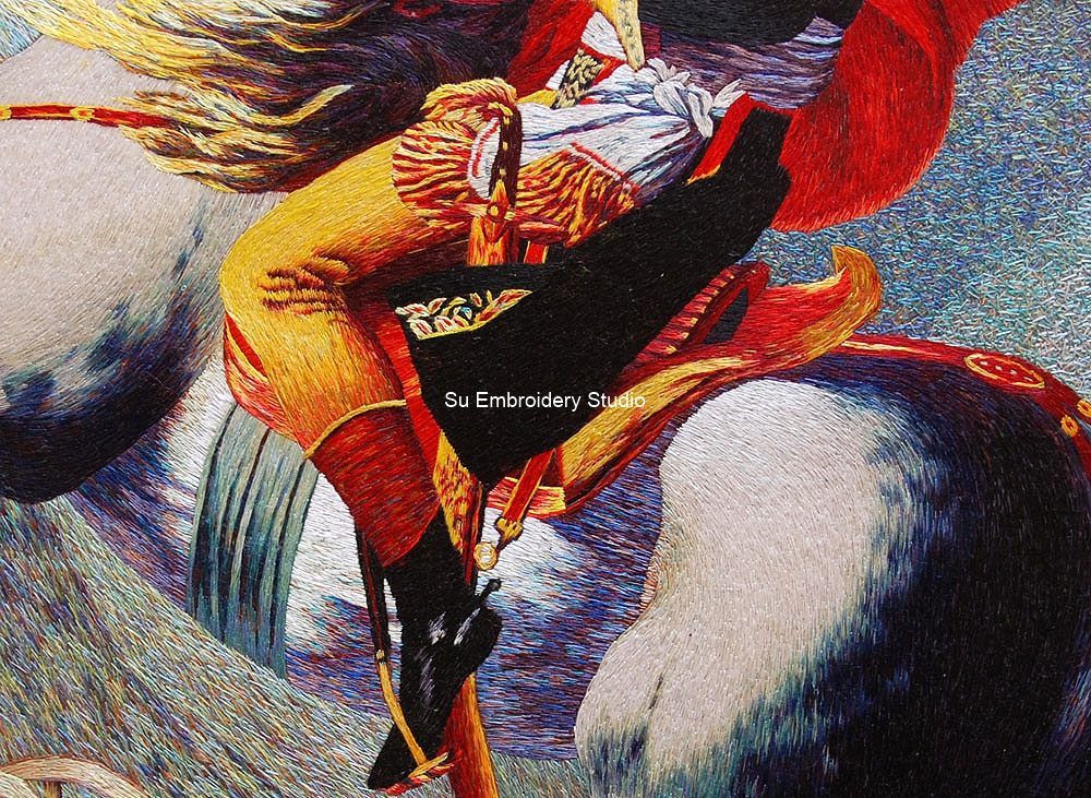 The artist's skillful interpretation of light and shadow using silk threads adds depth to the embroidery, enhancing the three-dimensional quality of Napoleon and his steed. Every stitch contributes to the overall texture, recreating the play of light on the folds of the uniform and the muscular contours of the horse.