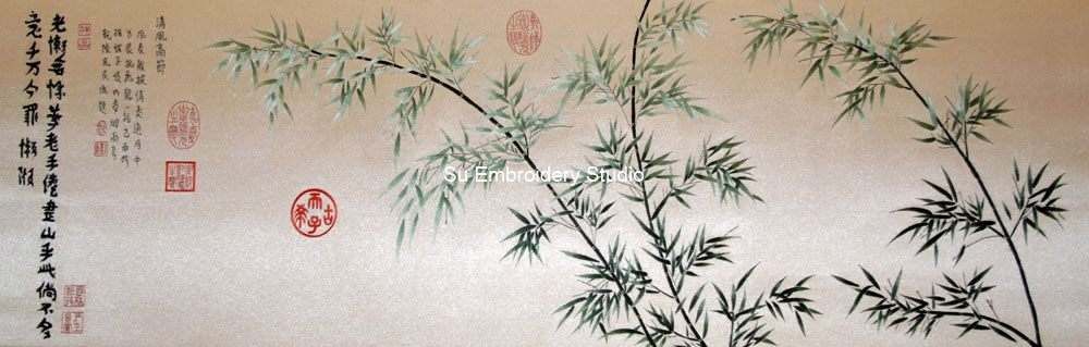 In summary, this silk embroidery, based on traditional Chinese ink painting, skillfully captures the beauty of bamboo through intricate stitching and thoughtful incorporation of calligraphy and seals. It stands as a testament to the rich cultural heritage and artistic finesse inherent in traditional Chinese silk embroidery.