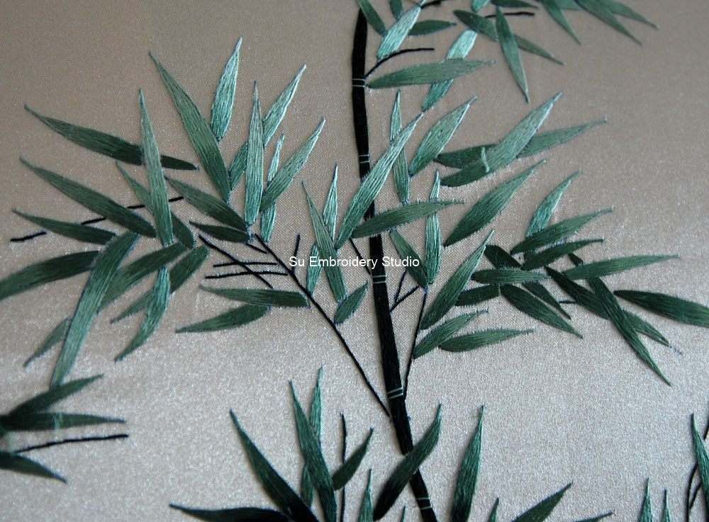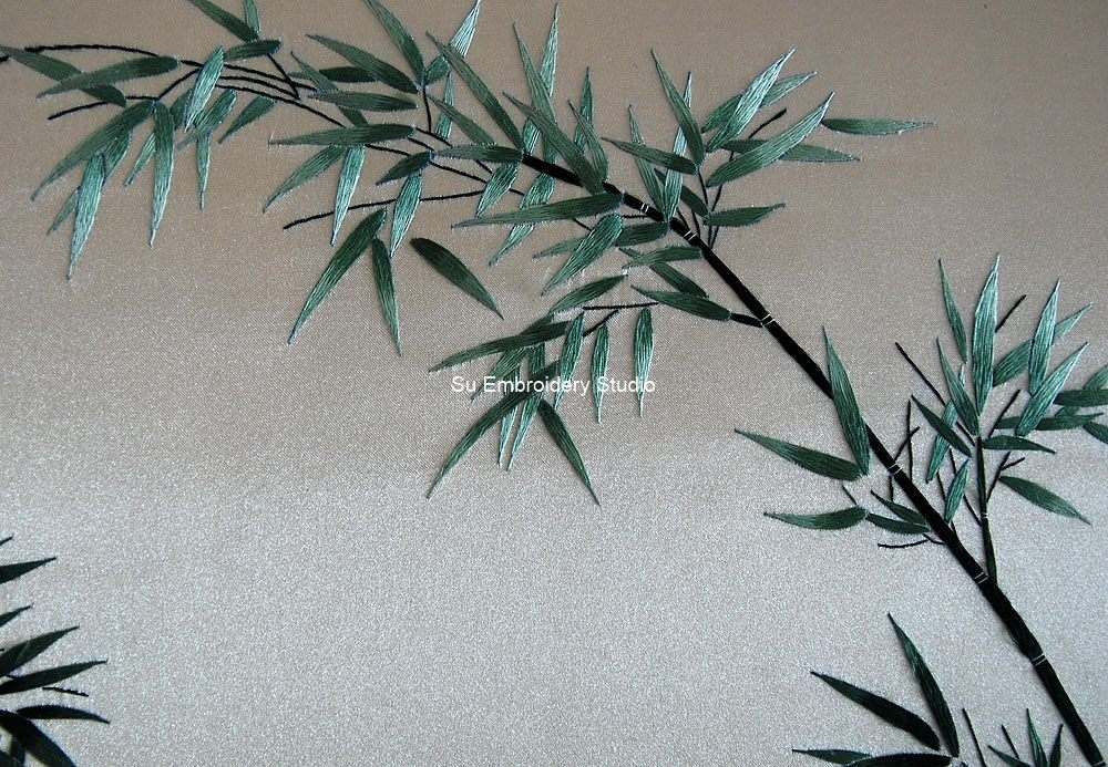 The leaves, finely embroidered with different shades of green, contribute to the overall vibrancy of the composition. The nuanced use of color creates a play of light and shadow, adding depth and dimension to the depiction of the bamboo foliage.