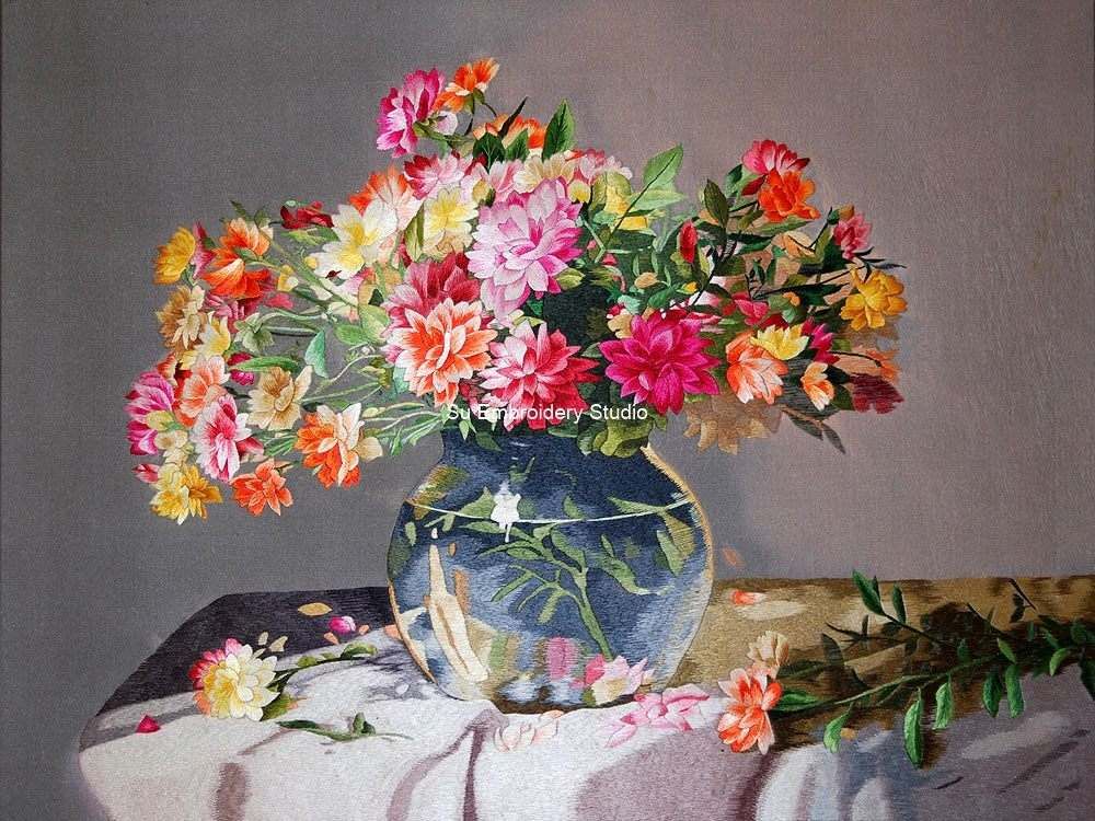 This is a beautiful Chinese silk embroidery features a vibrant bouquet of flowers arranged in an intricately designed vase. The flowers are in various shades of pink, red, orange, and yellow, giving the bouquet a lively and colorful appearance. Green leaves are interspersed among the flowers adding contrast to the bright colors. All of hte details are well hand embroidered with plain stitches which make the whole silk embroidery look dense and smooth. The bouquet is placed in an elegant vase with intricate designs, hand embroidered in white silk threads against a dark background. The vase sits on a draped cloth with folds, adding depth to the image. A few scattered flowers and leaves are embroidered around the base of the vase creating a naturalistic scene. The backdrop is plain which accentuates the detailed embroidery work on the foreground elements.