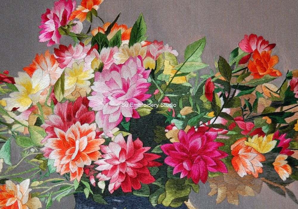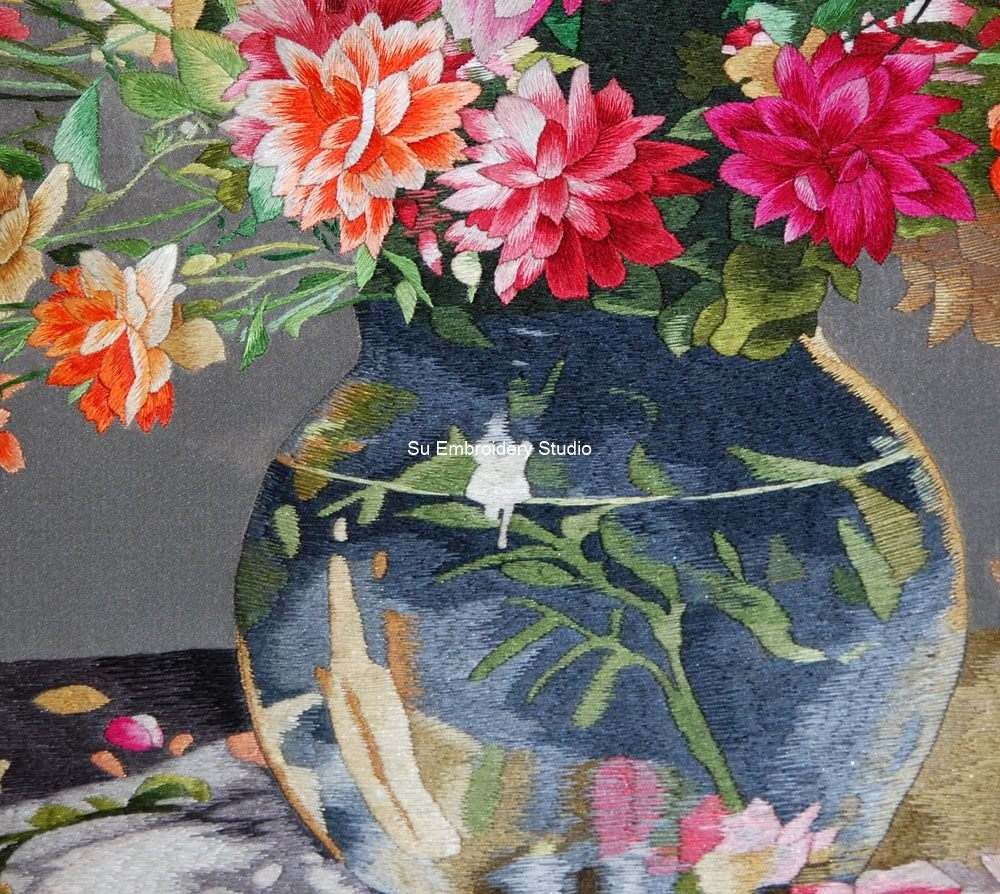 It is all hand embroidered with fine silk threads by embroidery artists from Su Embroidery Studio in Suzhou, China.