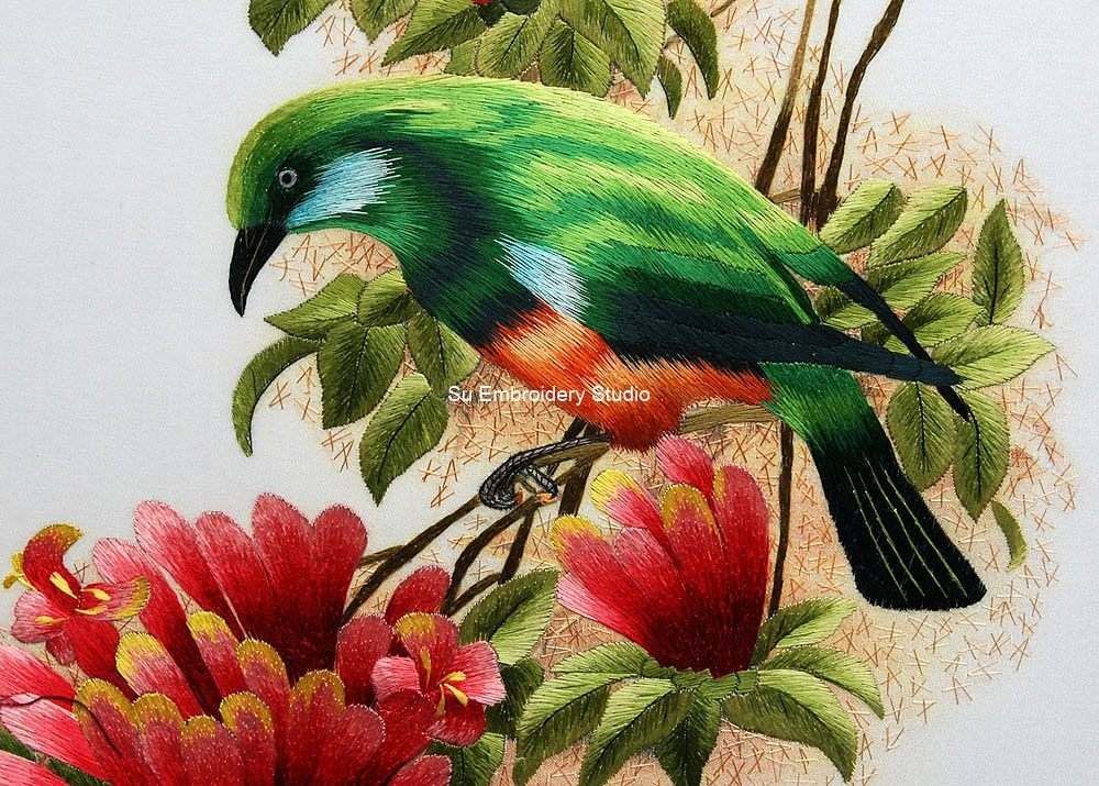 This is a vibrant Chinese silk embroidery featuring a colorful green bird perched on a branch adorned with blooming flowers. The bird, showcasing an exquisite blend of green and orange feathers hand embroidered with fine silk threads, is depicted amidst lush foliage and radiant flowers, capturing the essence of nature’s beauty. The meticulous stitches bring to life the intricate details, from the delicate petals of the flowers to the graceful feathers of the bird, making it a perfect piece for silk artenthusiasts and nature lovers alike.