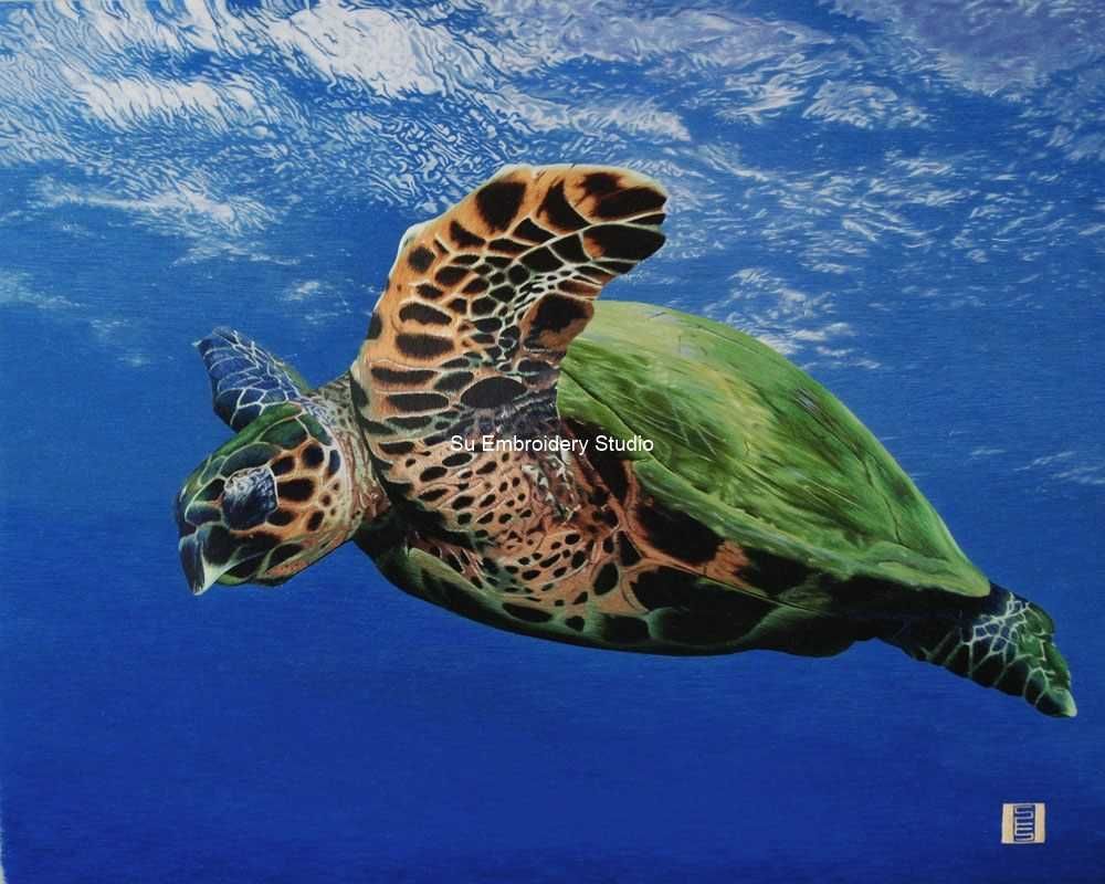 This hyper realistic silk embroidery masterpiece plunges viewers into the depths of the ocean, capturing the essence of a sea turtle gracefully swimming underwater. The intricate silk hand embroidery meticulously details the patterns on the turtle's shell and flippers with very fine silk threads, presenting a stunning blend of green and brown hues against the deep blue canvas of the ocean.