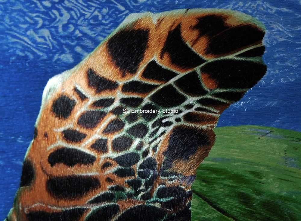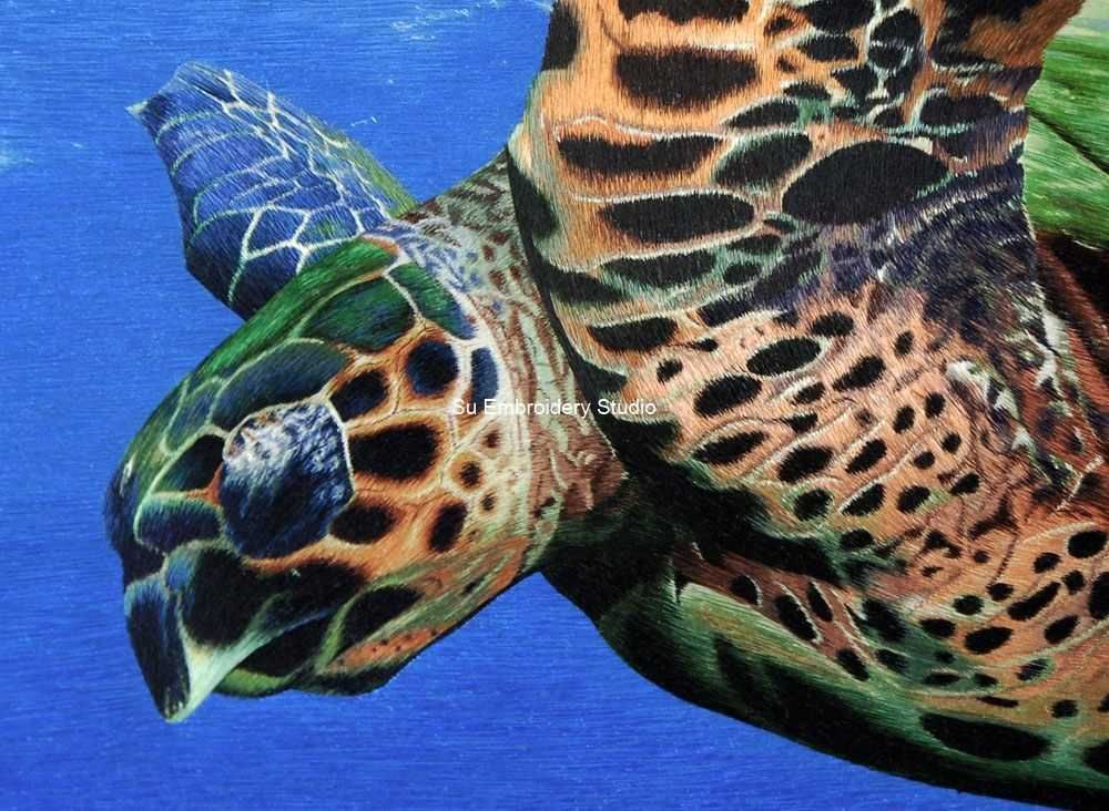 Every embroidery stitch contributes to the fine detailing, beautifully rendering the texture of the turtle's shell, the fluidity of its flippers, and the dynamic nature of the underwater environment.