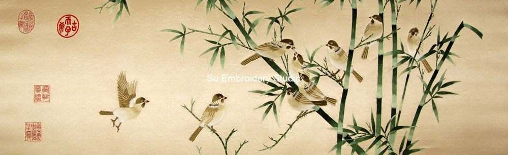 This Chinese silk embroidery depicts sparrows and bamboo. The sparrows are intricately hand embroidered, showcasing detailed craftsmanship, and the bamboo is elegantly designed to create a natural and serene atmosphere. The silk embroidery artwork features several sparrows; some are perched on bamboo branches while one is in flight. The birds are intricately hand embroidered with great attention to detail, each feather and feature is visible. Green bamboo branches stretch across the artwork, with leaves sprouting in various directions creating a lively scene. The background fabric has a soft beige color that complements the green of the bamboo and brownish hues of the sparrows. There are red seals or stamps scattered around the artwork, typical in Chinese art to represent the artist’s signature or an emblem of authenticity.