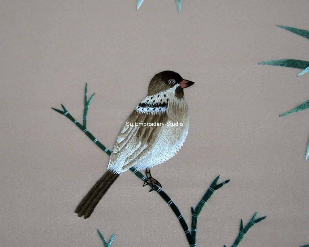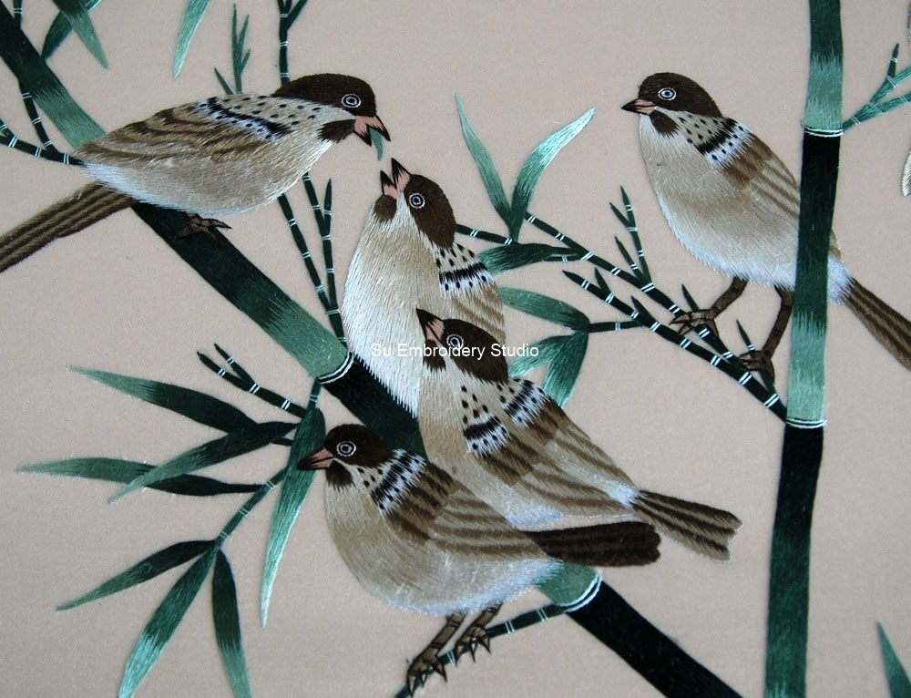 The embroidery artwork features several sparrows, each meticulously embroidered to showcase the finest details of their feathers and features. Some sparrows are perched gracefully on bamboo branches, while one is captured in mid-flight, adding dynamism to the scene. The attention to detail in rendering the birds imparts a lifelike quality to the hand embroidery.