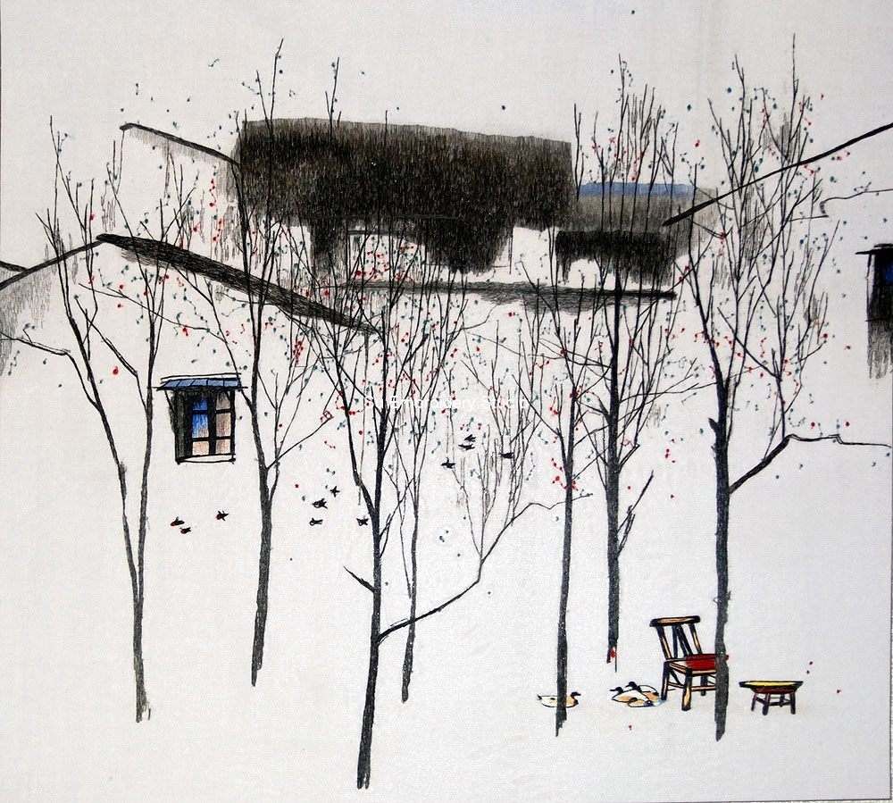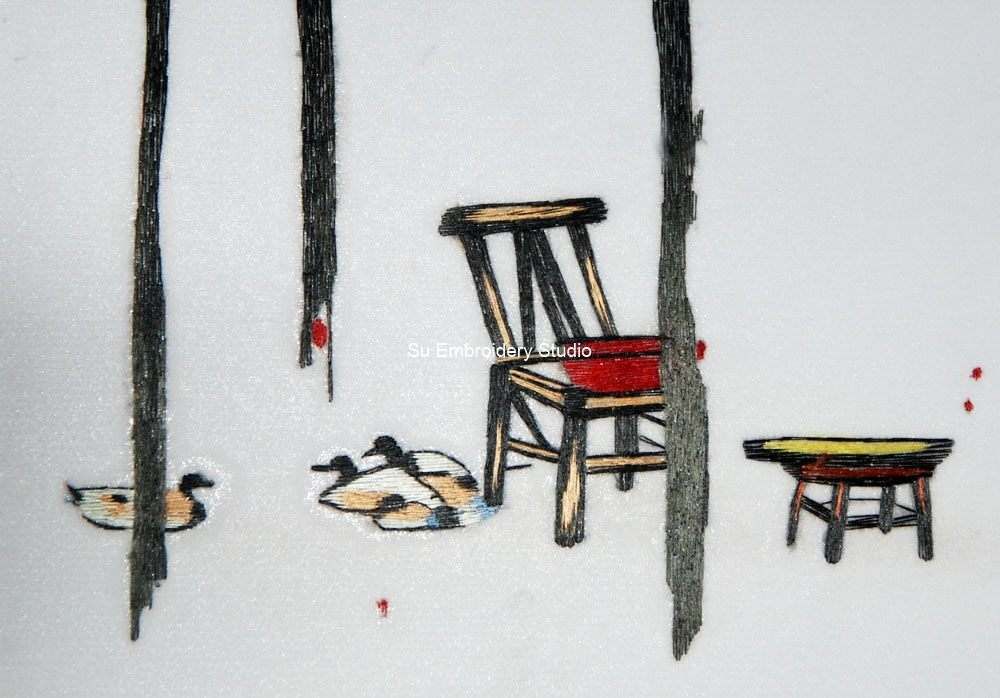 This Chinese silk embroidery depicts a serene and minimalist scene of buildings typical in Suzhou China. The hand embroidered painting is dominated by a white background to emphasize other elements. There are some bare trees with thin trunks and branches, adorned with small red blossoms or leaves scattered throughout. Traditional buildings are visible in the upper part of the embroidered painting; it has a dark roof and white walls. Below the trees, there are two pieces of outdoor furniture - a chair and a table - suggesting an outdoor setting. The overall mood of the embroidery painting is peaceful and calm, evoking feelings of solitude or quiet reflection.