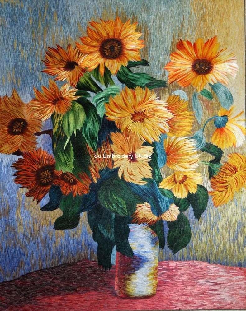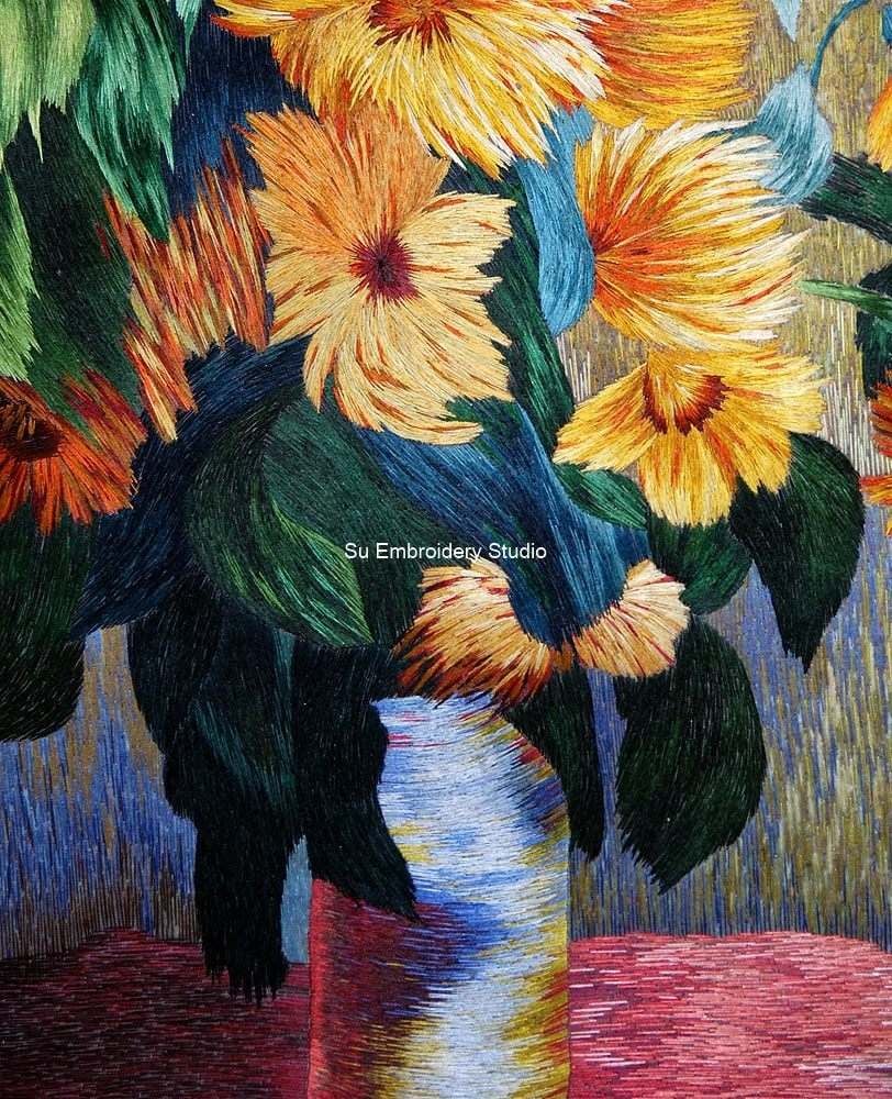 This Chinese silk embroidery features a bouquet of sunflowers in full bloom, housed in an elegant vase. The embroidery artwork captures the natural beauty and intricate details of each flower, showcasing petals in shades of golden yellow and orange achieved by mixing fine silk threads, contrasted by dark brown centers. The green leaves add a touch of freshness to the composition. The vase, with its subtle hues, sits on a red surface against a textured blue background, enhancing the visual appeal. The embroidery work is skillfully done, and each petal and leaf is finely hand embroidered, making it a true work of silk art. The background texture is hand embroidered too, achieved through precise silk threading, adds depth and contrast, making the floral elements pop.