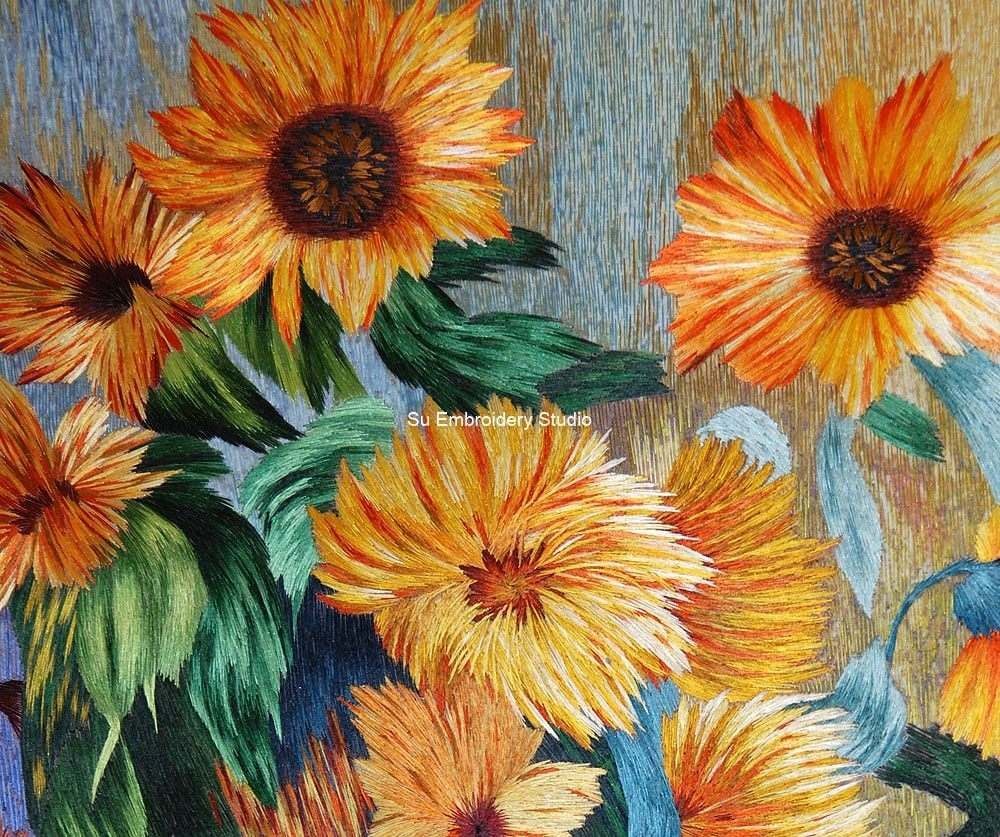 The skillful embroidery work is evident in the detailed rendering of each petal and leaf, making this piece a true work of silk art. The background, textured through precise silk threading, adds depth and contrast, allowing the vibrant floral elements to pop. The textured blue background complements the warm tones of the sunflowers and enhances the overall visual appeal of the artwork.