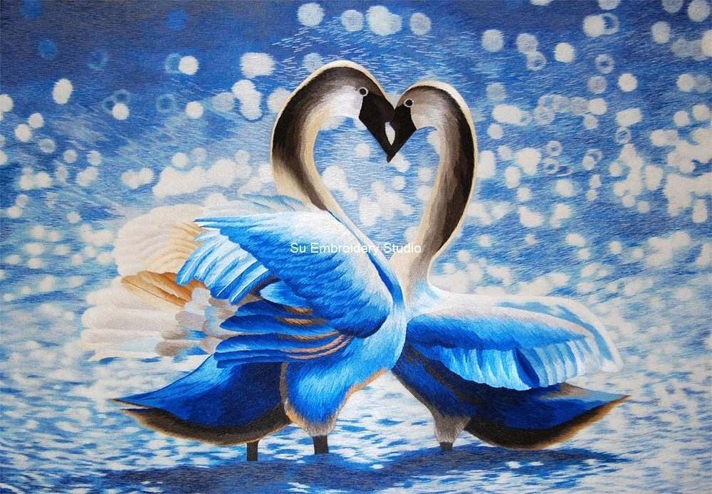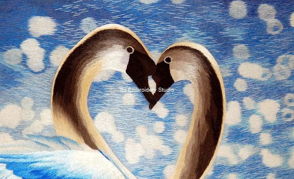 This Chinese silk embroidery features two elegant swans, their necks intertwined to form a heart shape, a symbol of love and unity. The swans are intricately hand embroidered with white and blue threads, showcasing the meticulous craftsmanship. Their feathers are depicted in exquisite detail, giving them a lifelike appearance. The background is adorned with an abstract pattern of blue and white hues, reminiscent of water ripples illuminated by moonlight. The whole embroidery artwork exudes romance and serenity, making it an ideal piece for adding a touch of elegance to any space.