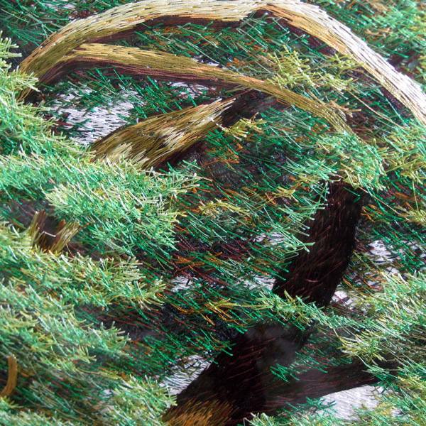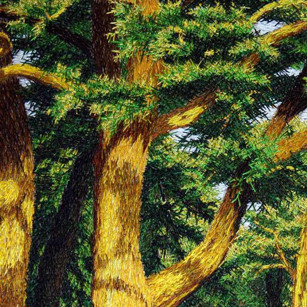 Machine embroidery often uses uniform-sized threads throughout the entire piece, whereas high quality silk embroidery employ split silk threads. These split threads are derived from a single full silk strand and vary in size. Silk embroidery artists use different thread sizes to achieve different textures and details in their work. For instance, facial features in portrait embroidery require thinner silk threads for a smoother, more realistic appearance. In contrast, machine-made embroidery uses threads that are all of the same size and not split.