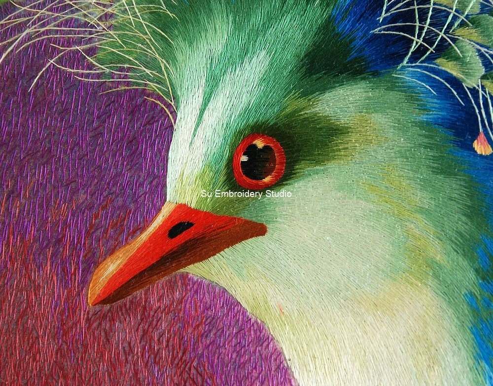 The body of the touraco is adorned with intricate feather patterns, incorporating a rich palette of colors, including shades of blue, green, purple, and white. The lifelike representation is achieved through meticulous silk threading, with every stitch contributing to the realistic textures and details that bring the artwork to life.