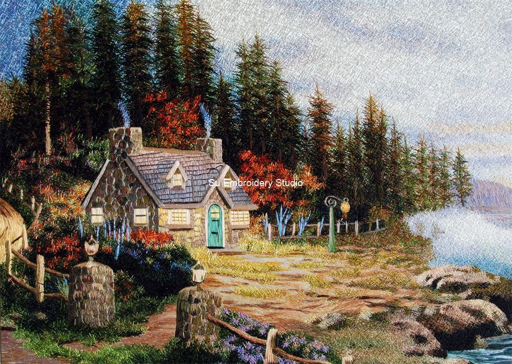 This is a detailed silk embroidery painting showcasing a serene and picturesque landscape. The embroidery artwork features a quaint stone cottage with a grey shingled roof and turquoise door, nestled amidst lush greenery. Tall pine trees, exhibiting the rich hues of green, surround the cottage, while autumnal trees with leaves in vibrant shades of orange and red add a pop of color to the scene. A well-trodden path leads to the cottage, bordered by stone walls adorned with hanging lanterns that illuminate the way. In the background, a tranquil lake reflects the clear blue sky above, offering a glimpse of nature’s untouched beauty.