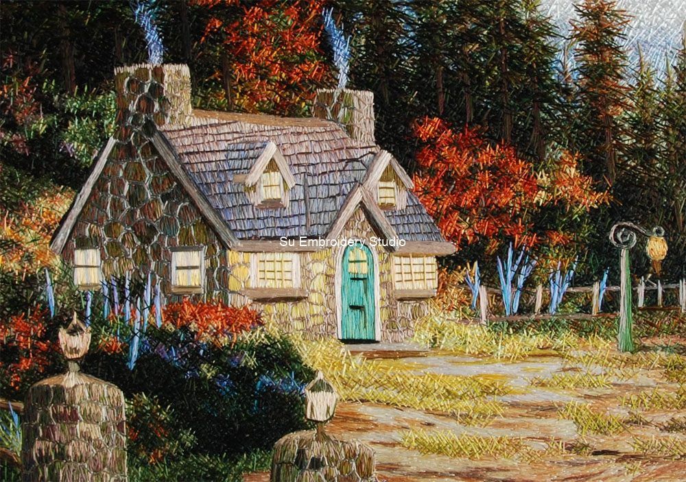 This intricate silk embroidery painting captures the serene and picturesque essence of a landscape, showcasing a quaint stone cottage with a grey shingled roof and a charming turquoise door. The cottage is nestled amidst lush greenery, surrounded by tall pine trees that exhibit rich hues of green. Adding a burst of color to the scene, autumnal trees with leaves in vibrant shades of orange and red create a picturesque backdrop.