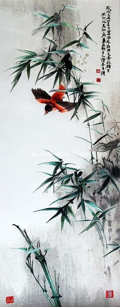 This exquisite silk embroidery captures a moment of sublime elegance in nature, presenting a resplendent red and black bird in mid-flight, gracefully navigating amidst vibrant green bamboo plants. The overall composition radiates tranquility, seamlessly fusing traditional Asian artistry with the graceful fluidity of the natural world.