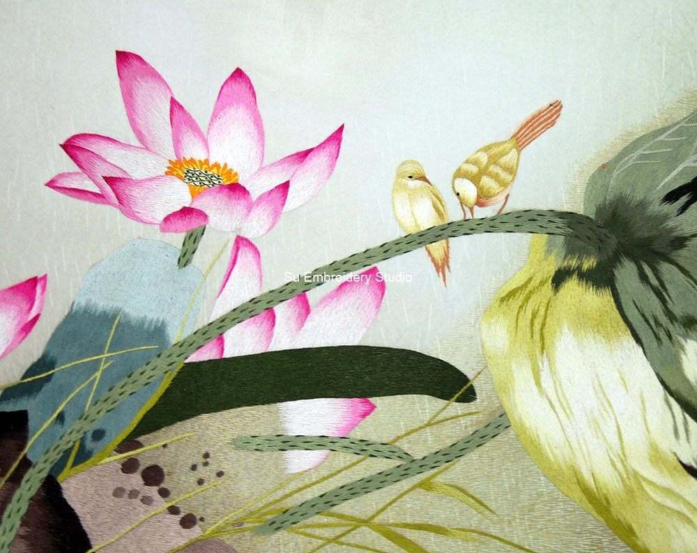 The careful attention to detail and the skillful use of color make this silk embroidery painting a captivating portrayal of nature's beauty. The composition, with its dynamic arrangement of birds and lotus blossoms, invites viewers to appreciate the harmony and elegance found in the delicate balance of the natural world. This embroidered artwork stands as a testament to the craftsmanship and artistry inherent in the tradition of Chinese embroidery.