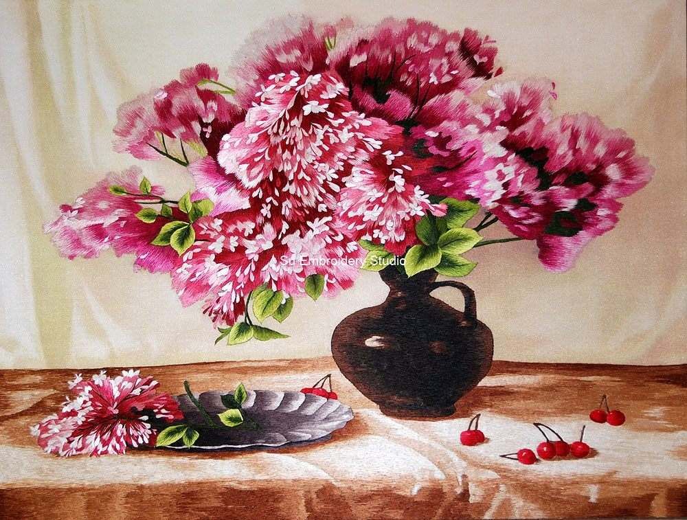 The skillful embroidery work is a testament to the craftsmanship involved in creating this piece. Each petal and leaf is meticulously detailed, making the embroidery artwork a true celebration of the art form. Soft lighting in the background enhances the texture of the silk, creating a play of light and shadow that adds to the overall visual richness. The embroidery exudes a sense of tranquility, making it an ideal piece for art collectors and flower enthusiasts alike.