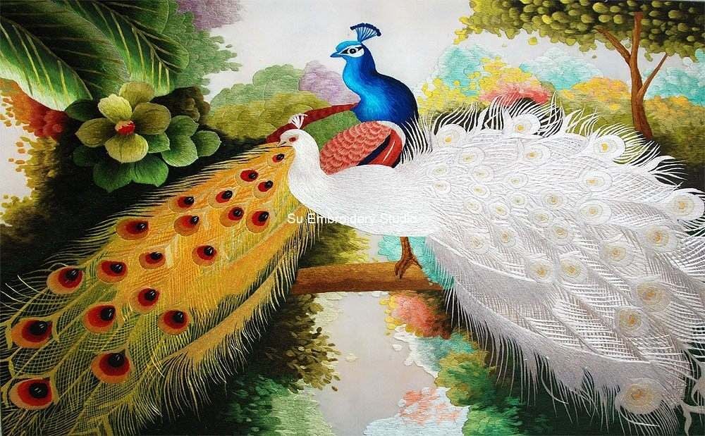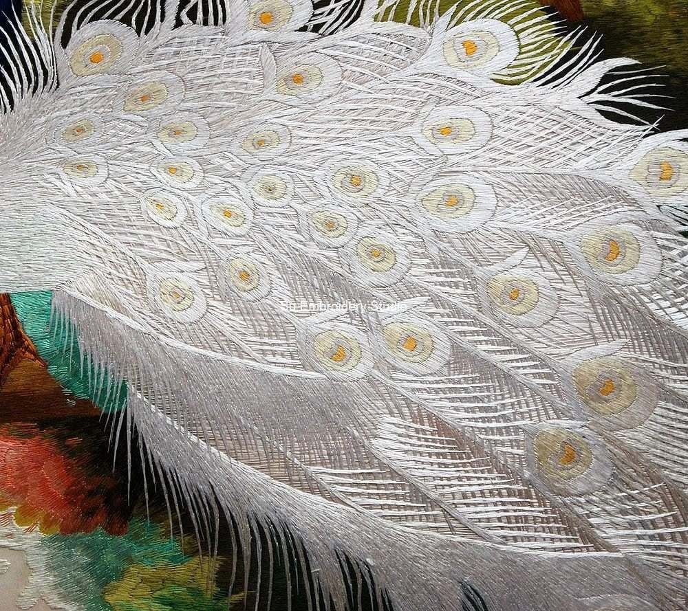 Every stitch in this embroidery work of art contributes to the overall mood, conveying a sense of natural beauty and elegance. The vibrant colors, meticulous craftsmanship, and attention to detail elevate this Chinese silk embroidery to a level of artistic excellence, inviting viewers to immerse themselves in the enchanting world of these majestic peacocks and the flourishing garden that surrounds them.