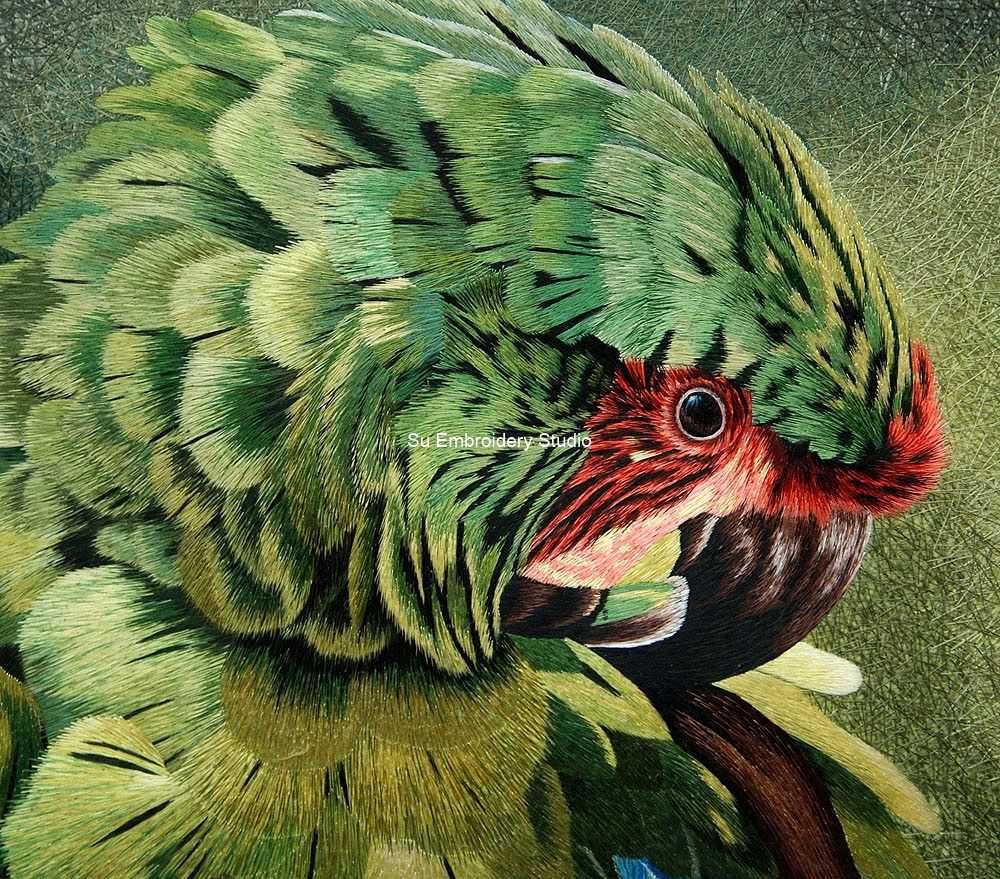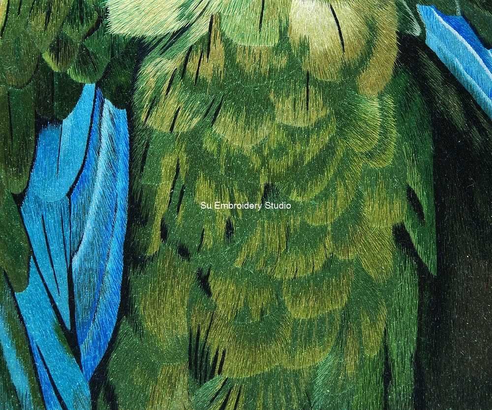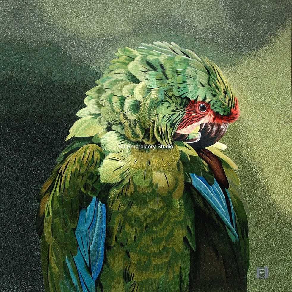 The background is textured with various shades of green, creating a moody and atmospheric backdrop that enhances the visual impact of the parrot. This subtle yet detailed background, which is also hand embroidered, allows the vibrant colors of the parrot to stand out prominently. The overall embroidery painting is a harmonious blend of lifelike representation and artistic interpretation, making this hand embroidered silk artwork a captivating piece for those who appreciate the beauty of nature and skilled craftsmanship.