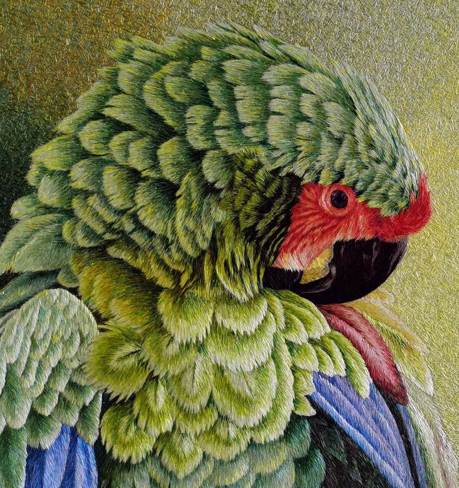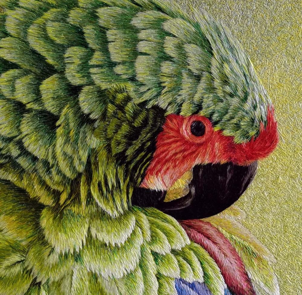 The parrot's eye, in striking red with intricate black detailing, adds intensity and personality to the bird's expression. Blue feathers on the wings contribute to the overall color palette, providing a delightful contrast to the predominant green hues. Each stitch in the silk embroidery is a testament to the artist's attention to detail, bringing out the intricate features and textures of the parrot's feathers.