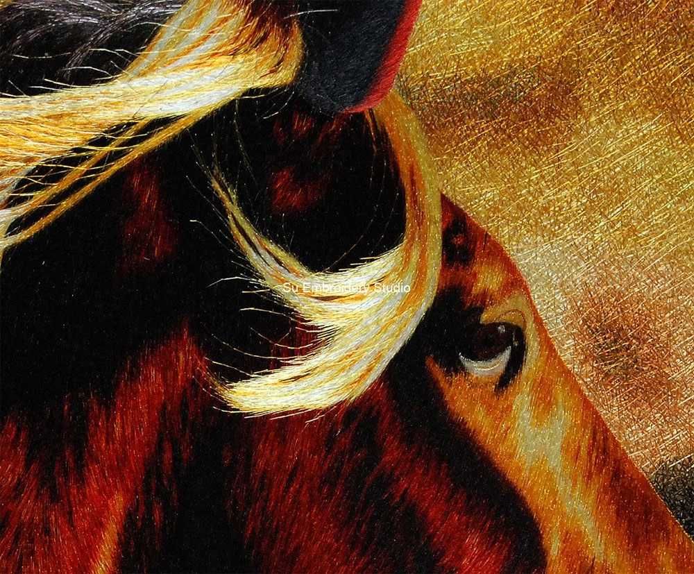 This collectible Chinese silk embroidery depicts a close-up portrayal of a horse, focusing on its head and mane. The silk embroidery captures the gleam in the horse’s eye, giving it a lifelike appearance. The horse has a rich brown coat with lighter, almost golden, mane flowing elegantly hand embroidered with short stitches. The stitches are meticulous, showcasing various shades to create depth and dimensionality in the embroidered horse. The background is abstract with dark and light hues intermingling, creating an ethereal glow that highlights the horse. The use of silk threads gives the embroidery artwork a unique texture and visual appeal, and the intricate stitches create detailed features and textures, capturing the essence of the horse.