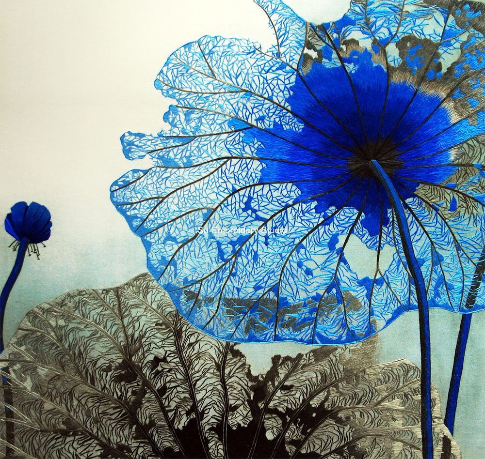 Accompanying the main blue is a smaller bud, rich in color, contributing to the overall composition by providing depth and contrast. The smaller bud, with its vibrant hues, creates a harmonious balance within the artwork, emphasizing the natural progression of blooming.