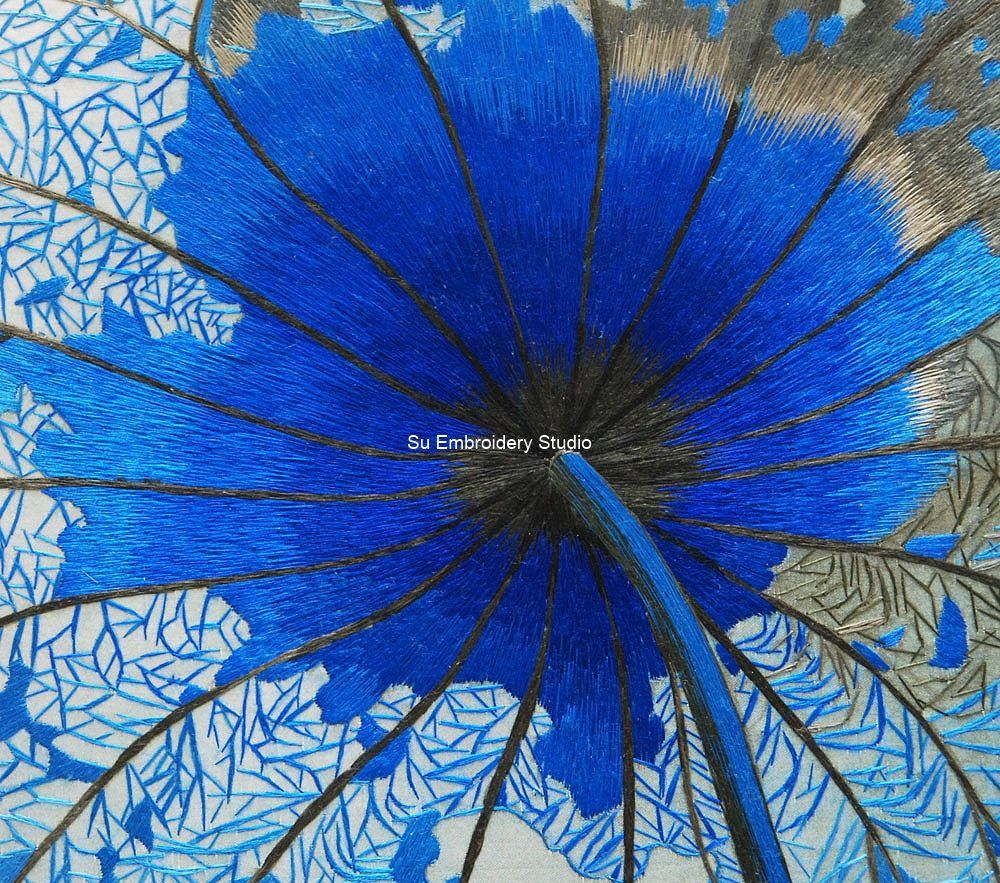 The background of the embroidered painting is adorned with detailed leaf patterns, presented in monochrome. This intentional choice creates a striking juxtaposition against the vivid blue hues of the flowers, enhancing the visual impact of the main subjects. The monochromatic leaves serve not only as a backdrop but also as a complementary element that frames and highlights the intricate beauty of the delicate blue lotus leaf.