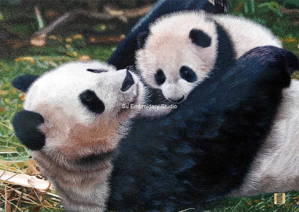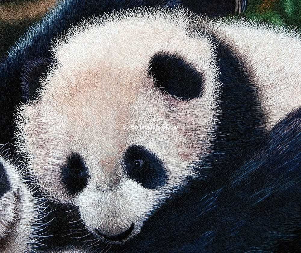 This silk embroidery not only captures a moment in the lives of these iconic creatures but also conveys a narrative of familial love and the pure bliss of maternal care. The delicate artistry of the silk threads transforms the visual experience into a sensory one, allowing you to feel the softness of fur and the palpable tenderness between parent and cub. An exquisite addition to any collection, this silk embroidery artwork is an invitation to immerse yourself in the gentle embrace of panda affection brought to life through the artistry of hand embroidered silk threads.
