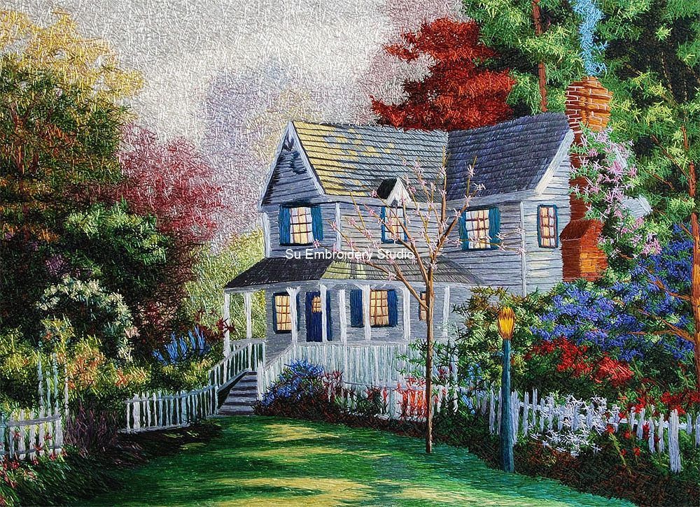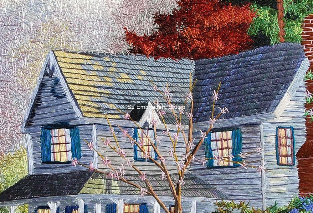 This vibrant silk embroidery painting portrays a picturesque scene of a cozy, classic two-story house embraced by lush, colorful gardens and trees. The detailed artwork masterfully captures the essence of a serene and beautiful garden landscape. Enclosed by a white picket fence, the front yard of the house radiates a quaint and charming aesthetic.