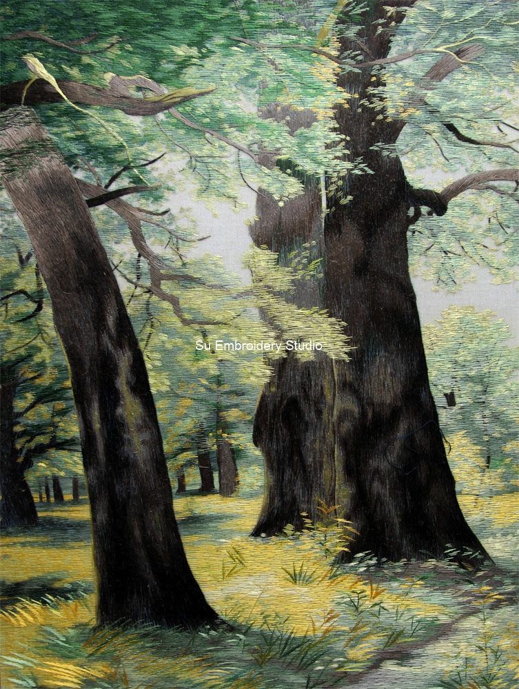 This intricate silk embroidery painting transports you into a detailed and serene forest scene, capturing the essence of a lush and vibrant woodland setting. Towering oak trees dominate the composition, their textured bark meticulously embroidered to convey a sense of age and grandeur. The forest canopy above is alive with vibrant green leaves, creating a lush and shaded retreat.
