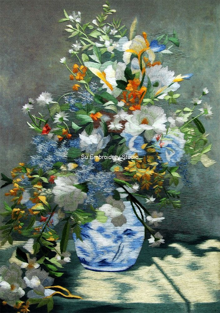 This silk embroidered painting depicts a bouquet of various types of flowers. The flowers are multicolored, with white, yellow, blue, orange, and green hues prominently featured. They are arranged in an intricate manner, showcasing the diversity of petal shapes and sizes. The vase holding the flowers is painted in blue and white colors with visible brush strokes indicating its round shape. A dark background contrasts sharply with the bright colors of the flowers, highlighting their beauty. Shadows cast by the bouquet create an interesting visual effect on the surface below.