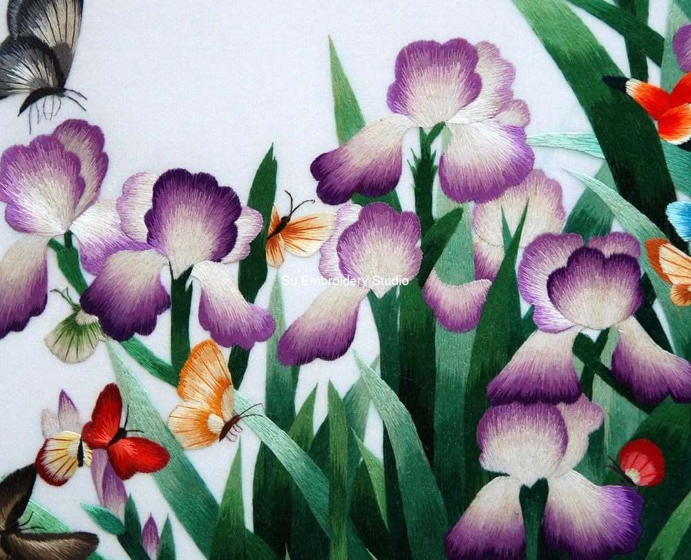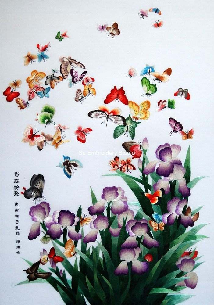 This exquisite thread painting captures the vibrant and colorful essence of nature, celebrating the awakening of spring in a harmonious display. The focal point of the silk embroidery artwork is a multitude of butterflies, each meticulously embroidered with intricate detail, fluttering gracefully above a lush garden adorned with blooming irises.