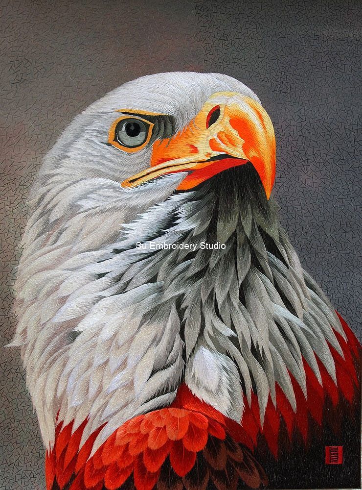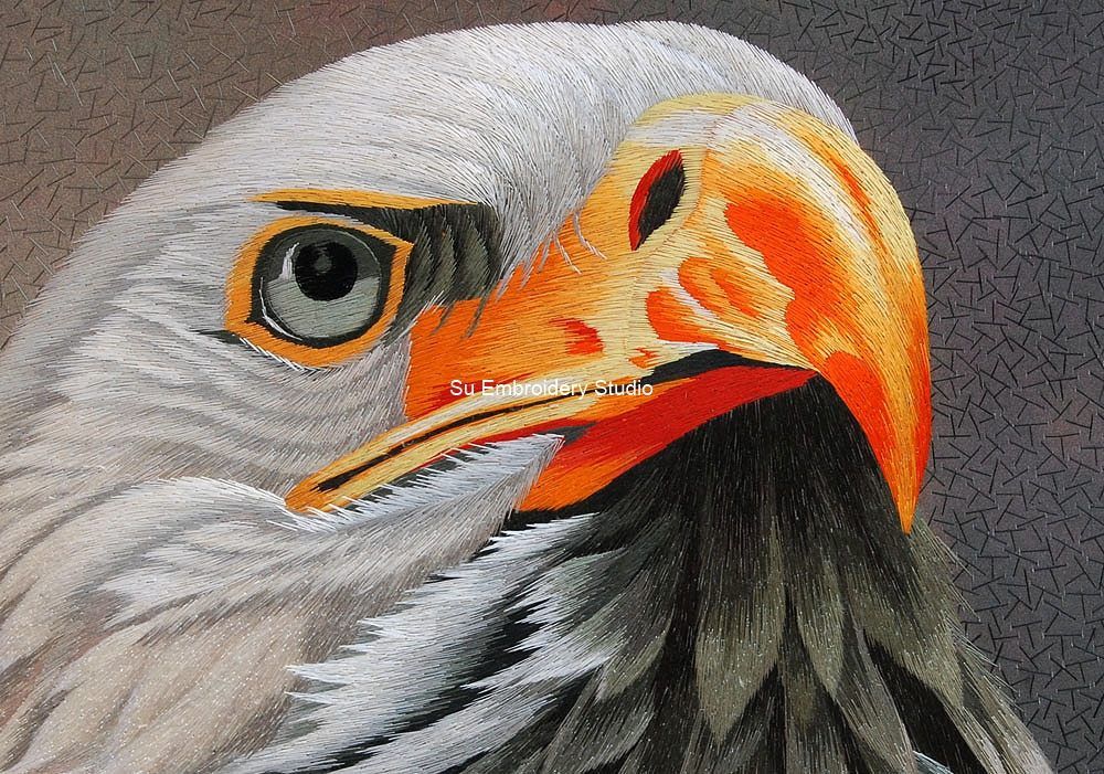 This is a highly detailed silk embroidery painting. It features a close-up view of an eagle’s head and upper body. The eagle has intense golden eyes that are sharply focused. Its feathers are intricately hand embroidered with varying shades of grey on its head transitioning to deep reds on its body. The orange beak is prominent and vividly embroidered with fine silk threads. Each stitch adds texture and depth to the artwork making it lifelike.